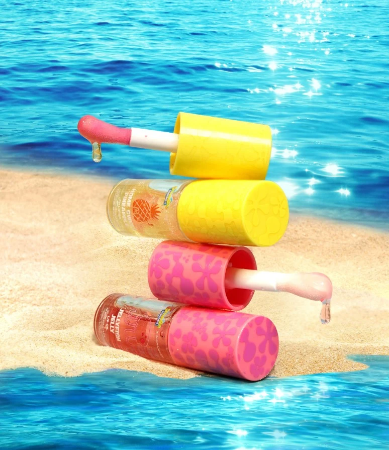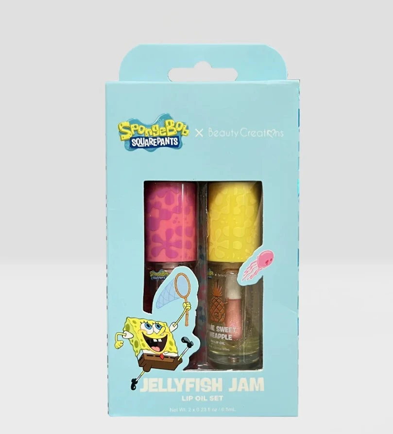 Set Jellyfish Jam Lip Oil con dos fórmulas: hidratante vibrante y tono personalizado según pH. Colección Bob Esponja x Beauty Creations.